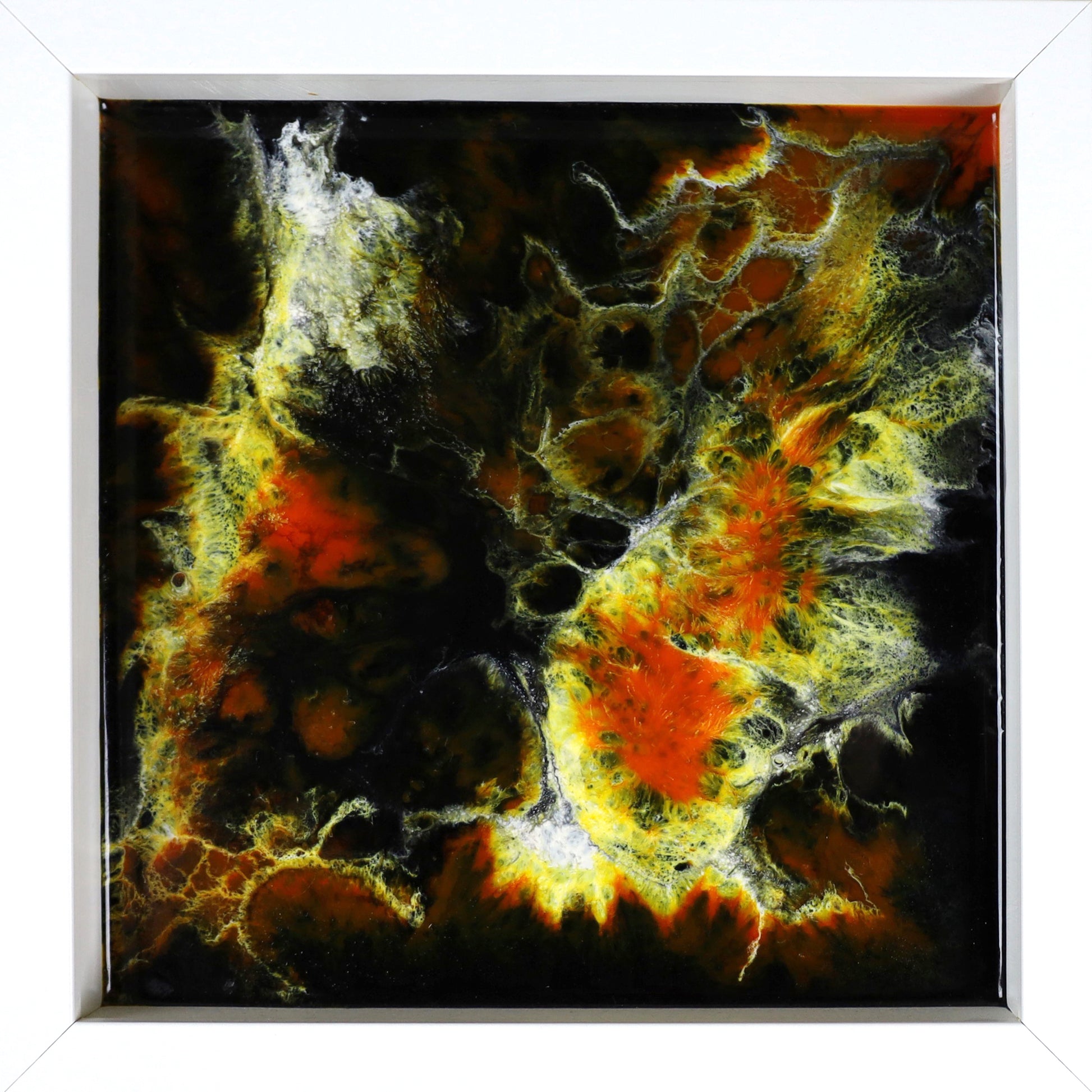 Denna unika målning är skapad med resin (epoxykonst) som hällts i lager för att skapa ett fantastiskt djup och en slät, glasliknande yta. Varje verk i denna serie är ett abstrakt flöde av färg och ljus som ger ett intensivt och tredimensionellt intryck. Resintekniken gör att ingen tavla är den andra lik, och de fångar ögonblicket av flytande rörelse i tid och rum.