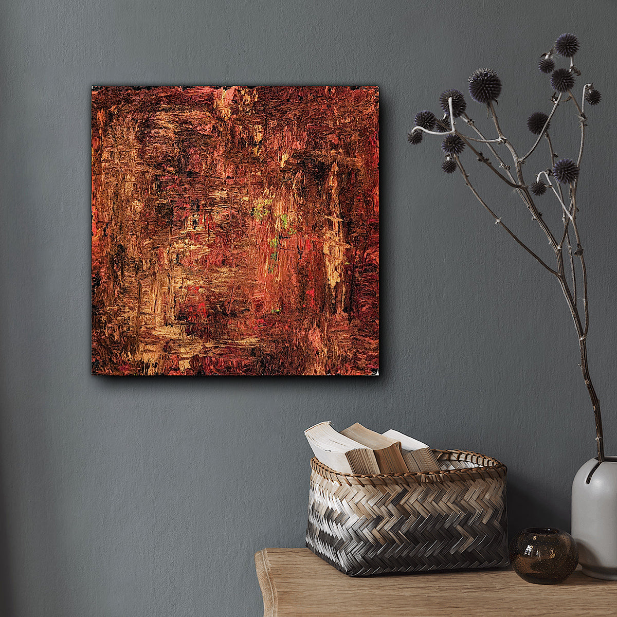 Denna abstrakta tavla, målad av Jonas Weikel, är en djärv och uttrycksfull komposition som domineras av rika bruna toner. Användningen av spackelspade och sand skapar en grov, taktil yta som ger målningen en imponerande tredimensionalitet. Djupa, jordnära bruna nyanser utgör basen, medan livliga inslag av rött och gult bryter igenom och tillför värme och energi till verket. De röda och gula accenterna skapar en dynamisk kontrast mot de mörkare bruna färgerna, vilket ger en känsla av rörelse och vitalitet. Denna kombination av färger och texturer gör målningen till ett engagerande och visuellt fängslande konstverk, som bjuder in betraktaren att utforska dess djup och komplexitet.