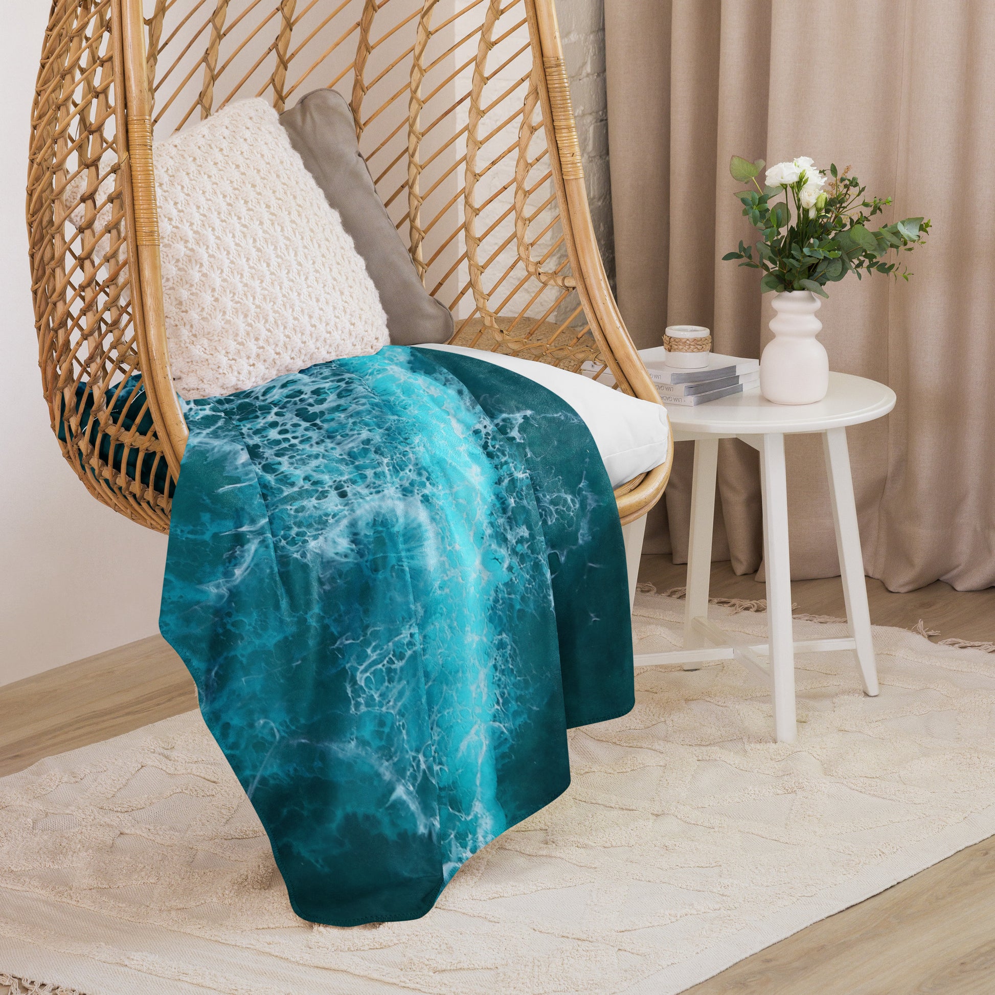 Friskhet och Klarhet till Ditt Hem. Upplev den uppiggande känslan av havet i din egen soffa. "Ocean"-filten fångar det dramatiska turkosblåa vattnet och skummande vågtoppar. Detta mönster ger ett rum energi samtidigt som det verkar lugnande. Den ultimata filten att svepa in sig i när du vill drömma dig bort till en solig strandkant.