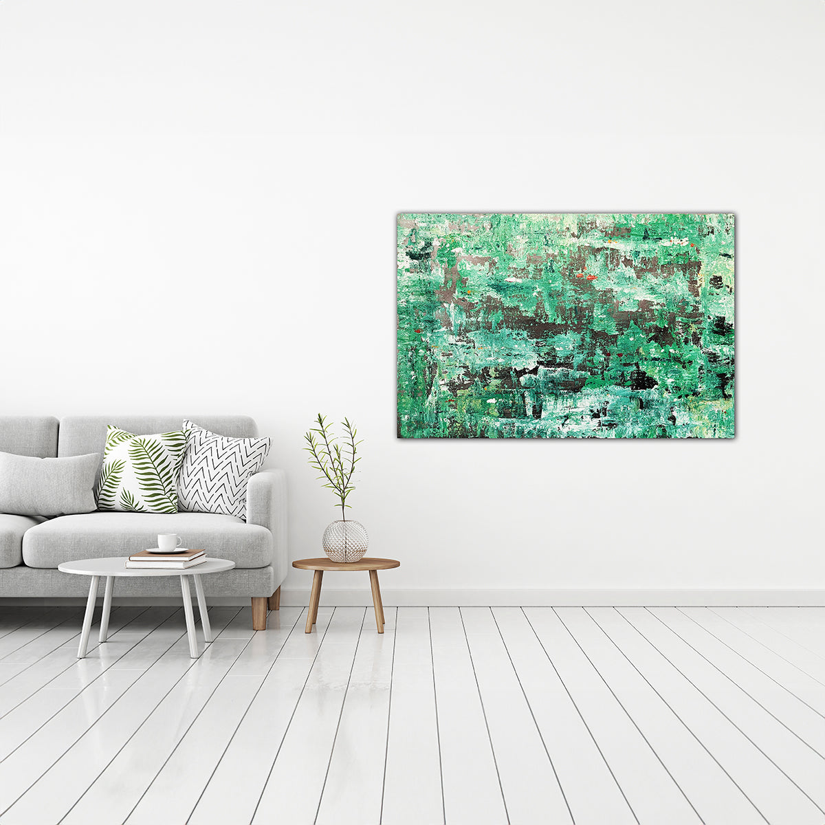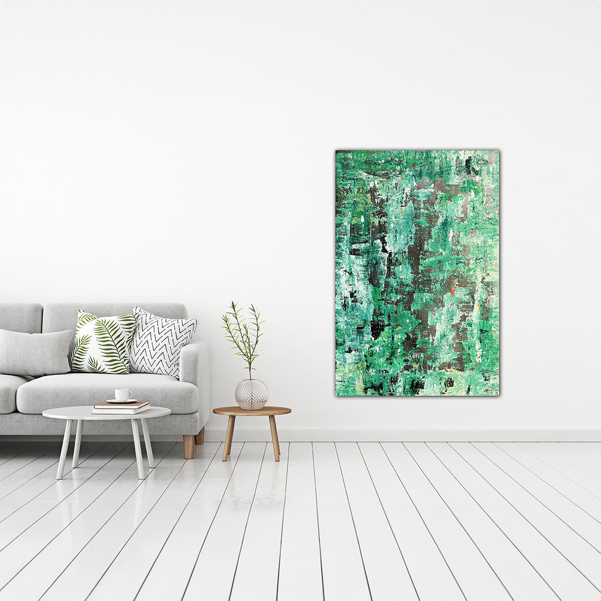 Denna abstrakta tavla, skapad av Jonas Weikel, är en uttrycksfull komposition med rik textur och djup. Målningen är gjord med spackelspade och innehåller en betydande mängd sand, vilket ger en grov och taktil yta. Dominerande gröna nyanser skapar en lugnande och naturinspirerad känsla, medan inslag av svart och vitt tillför kontrast och dynamik. Små stänk av rött och orange ger subtila accenter som fångar ögat och tillför ytterligare liv och rörelse till verket. Användningen av spackelspade ger målningen en unik struktur och tredimensionalitet, som bjuder in betraktaren att utforska dess många lager och skiftande mönster.