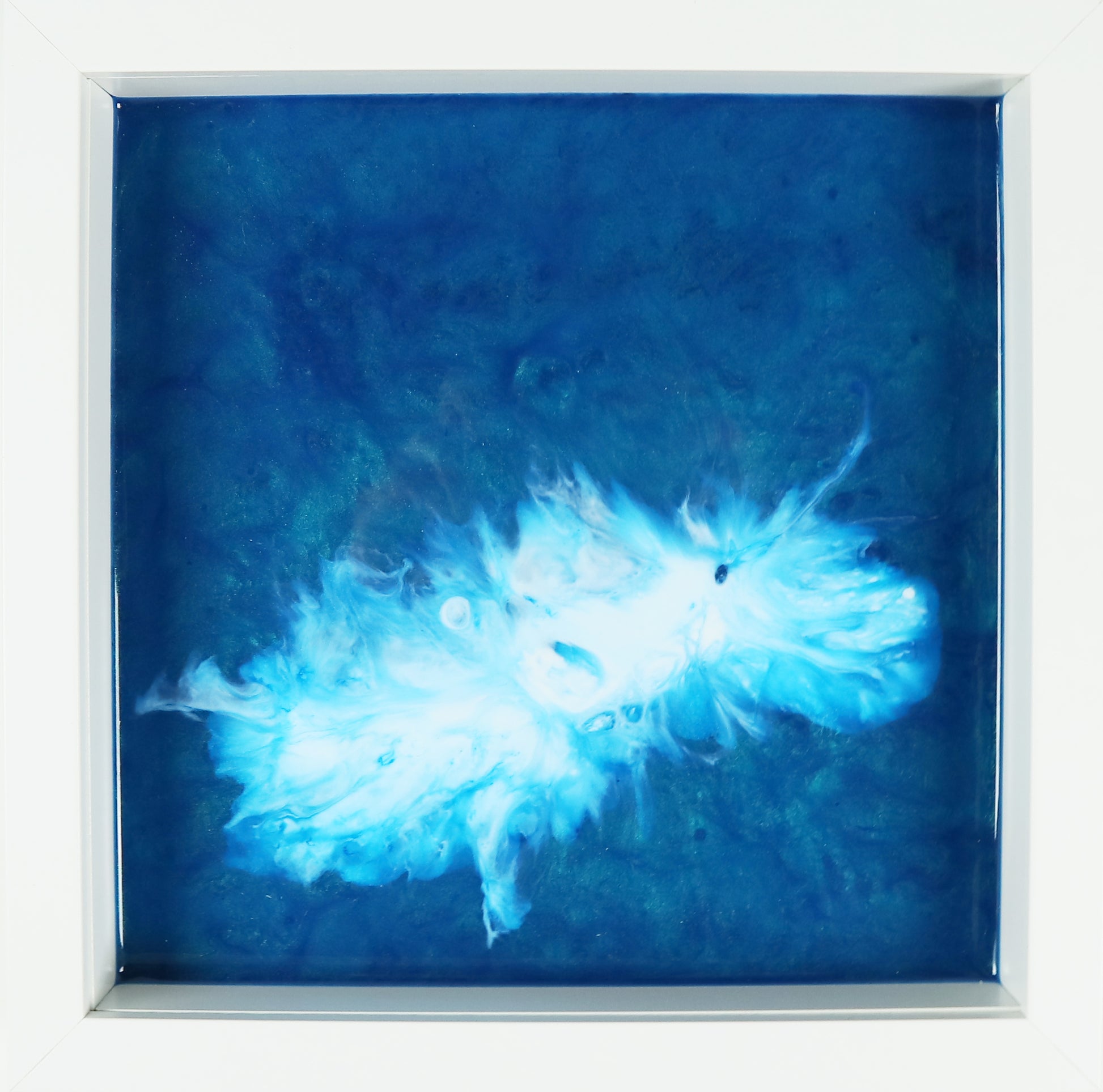 Ett lugnt, fokuserat verk där ett koncentrerat utbrott av vitt och ljusblått skum är inneslutet i ett djupt, monokromatiskt havsblått fält. Målningen fångar den stilla kraften i en våg som bryter tyst i ensamhet, full av djup och klarhet.